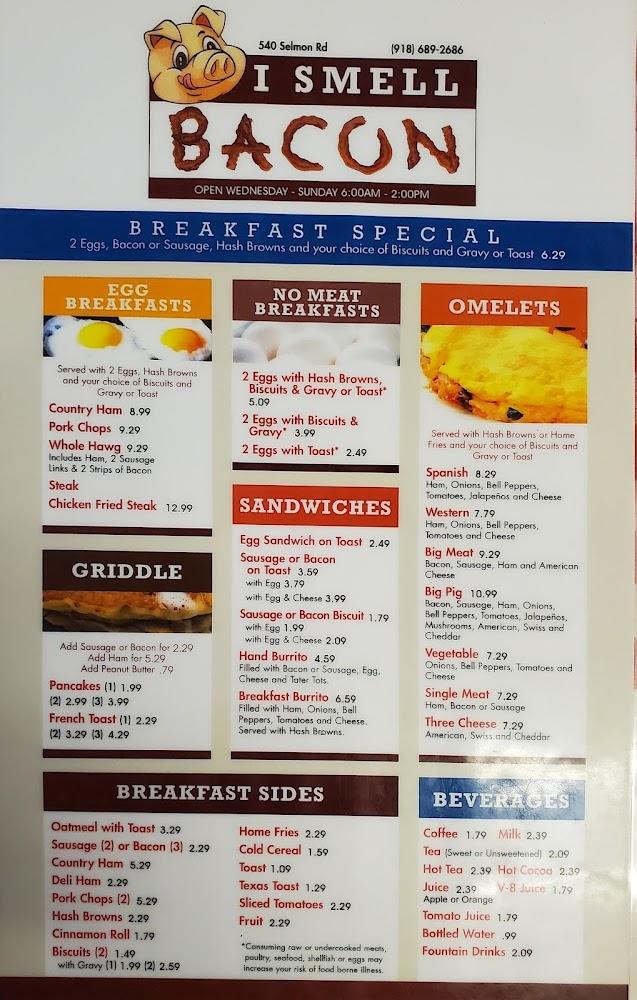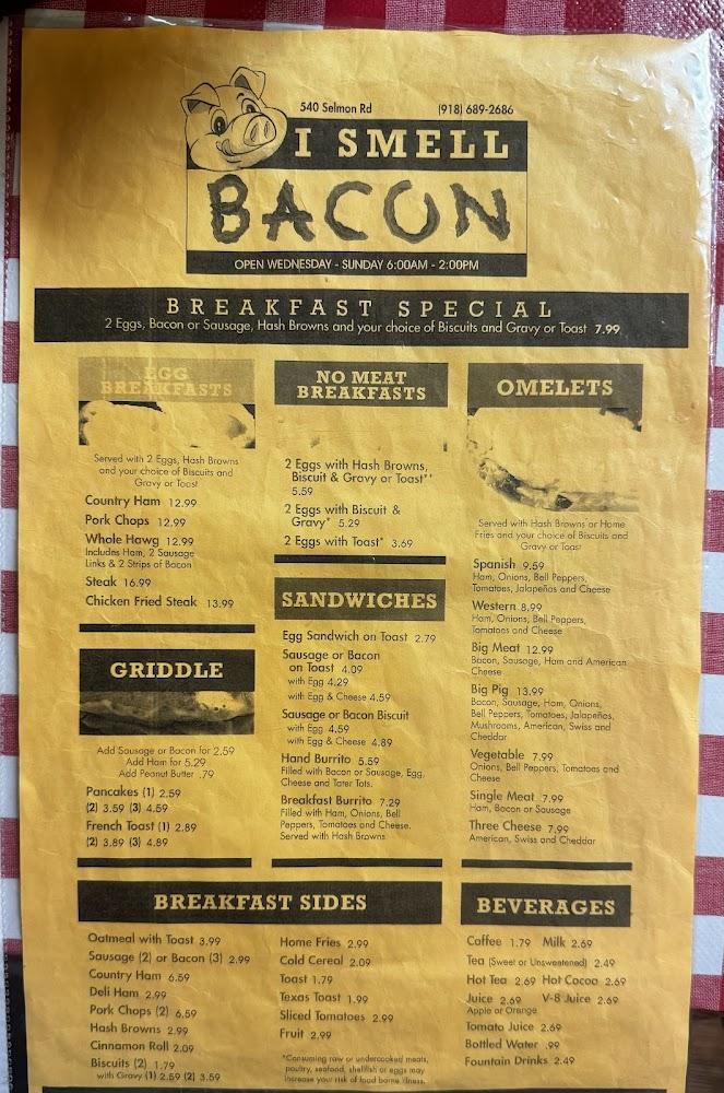 Welcome to I Smell Bacon, Eufaula's favorite breakfast spot located at 540 Selmon Rd. Indulge in our delicious selection of traditional American fare, including our famous hash browns and local specialties, served in a relaxed and trendy atmosphere. Whether you're grabbing a quick bite or enjoying a leisurely brunch, our welcoming staff is here to cater to your needs, offering dine-in, takeout, and delivery options. With accessible facilities and a kid-friendly menu, we’re perfect for families and solo diners alike. Join us for a memorable meal in a cozy setting, and let the aroma of freshly cooked bacon greet you as you arrive!